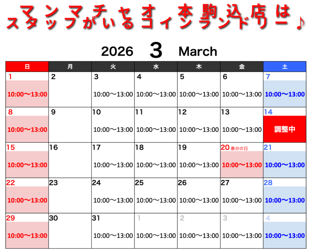 3月に入りました。 スタッフ在店カレンダーを更新しました。